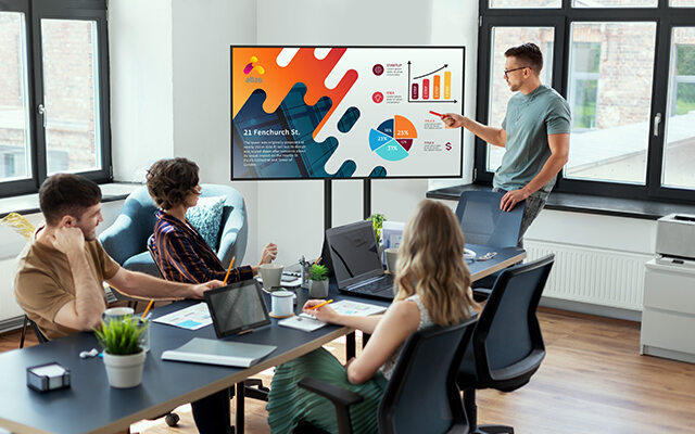 MultiSync® ME-serien (43” upp till 98”) är lämplig för kostnadskänsliga applikationer inom butiksskyltning.De multifunktionella Sharp MultiSync®-skärmarna med matt panel, inbyggd USB-C-anslutning som tilltalar användare som vill ha enkelhet med Bring Your Own Device (BYOD), vilket stödjer hybrida arbetsflöden och spontana möten.
