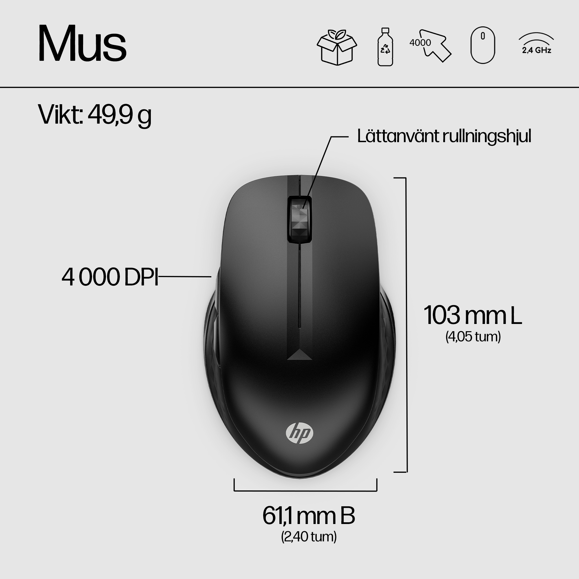 HP 430 - Mus - ergonomisk - flera enheter - höger- och vänsterhänta - 5 knappar - trådlös - Bluetooth 5.0, 2.4 GHz - trådlös USB-mottagare - gagatsvart - för HP 21, 22, 24, 27; Laptop 14, 15, 17; Pavilion 24, 27, 32, TP01; Pavilion Laptop 15